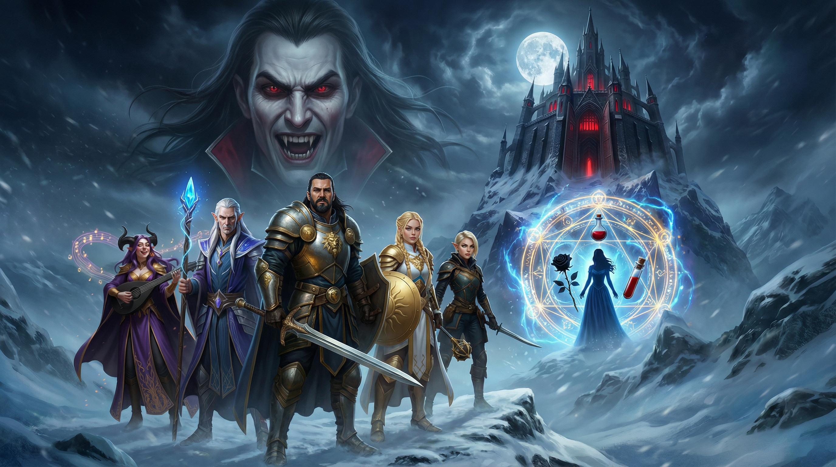 Begib dich auf eine gefährliche Reise durch die düsteren Lande von Valdoria. Fünf Helden – der paladinische Beschützer Dorian, die zwergische Klerikerin Thargrima, der hochelfische Magier Elarion, die halbelfische Schurkin Kaeleen und die tieflingische Bardin Lyra – müssen den mächtigen Herzstein bergen, bevor er in die falschen Hände fällt. Erlebe epische Kämpfe, knifflige Entscheidungen und eine Geschichte voller Intrigen, Magie und Abenteuer.